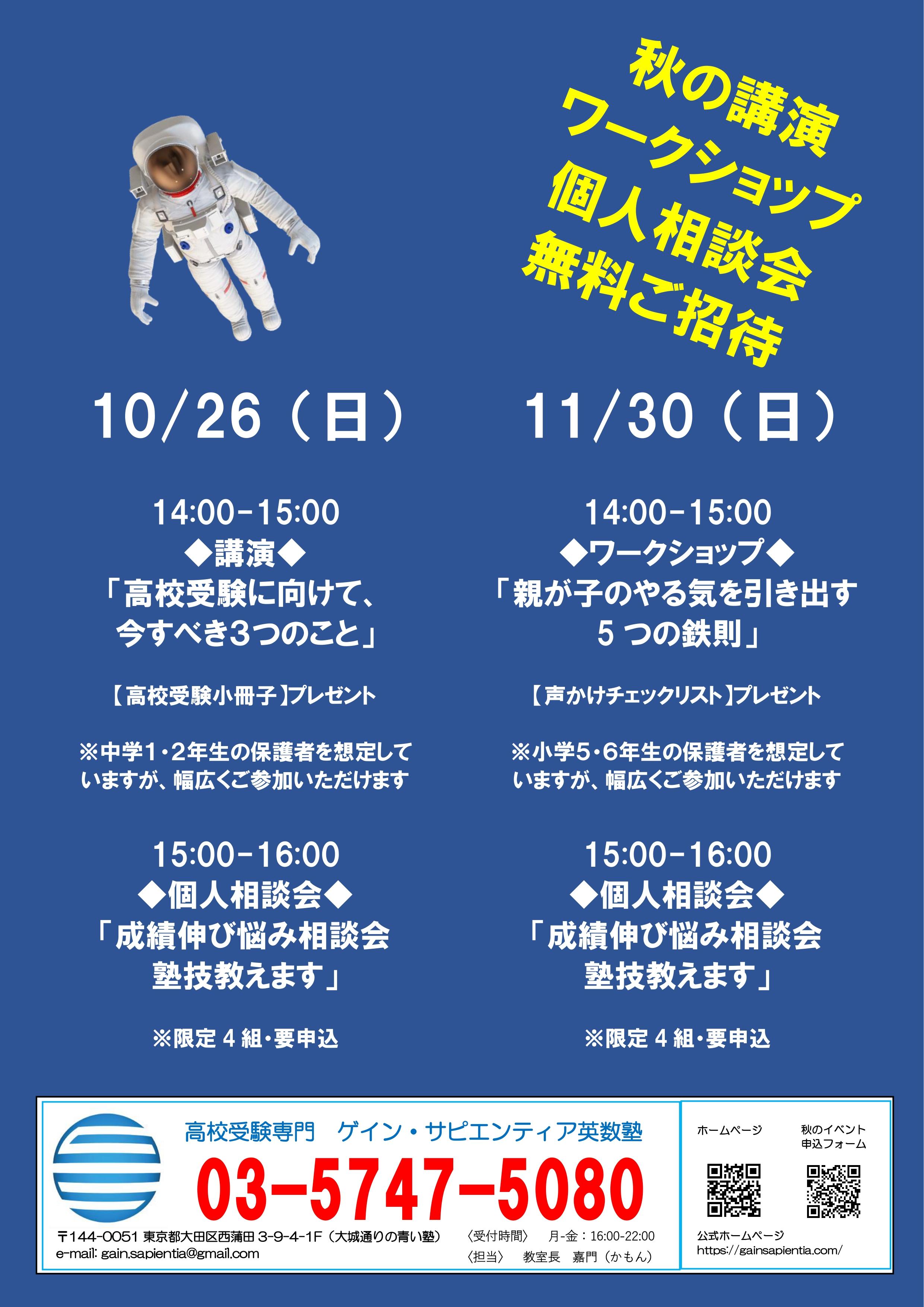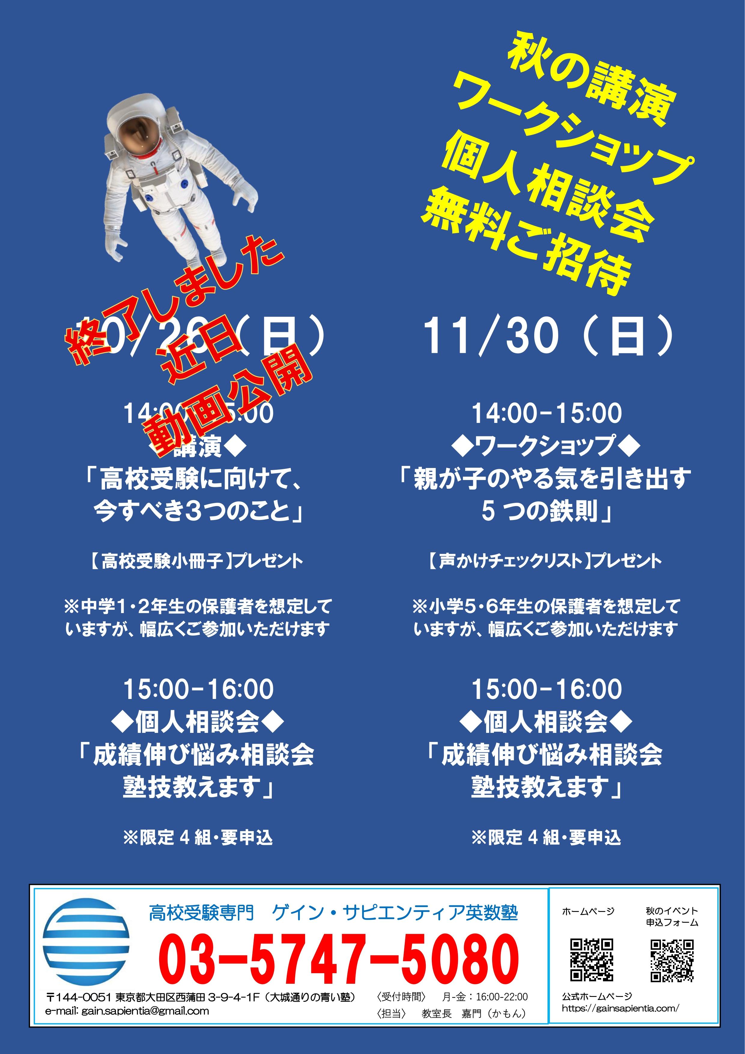 2025,10,13 | 【保護者】秋の保護者セミナーを開催します。10/26「高校受験に向けて、今すべき3つのこと」、11/30「親が子のやる気を引き出す5つの鉄則」を開催します。それぞれ【高校受験小冊子】【声掛けチェックリスト】をプレゼント。詳細・お申込みはこちらから⇒【秋の保護者セミナー:詳細・申込】(googleform)※申込〆切:開催日前日まで |