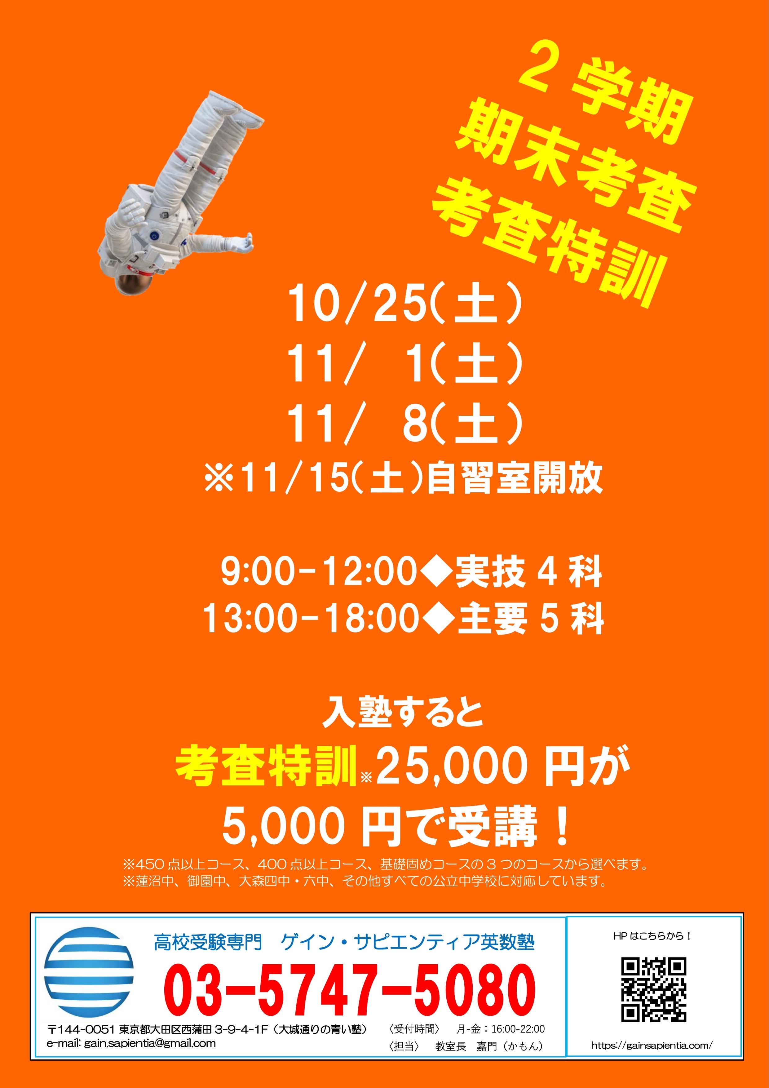 2025,09,29 | 【中学部】2学期期末、真っ向勝負の考査特訓が始まります。「450点以上」「400点以上」「基礎固め」の3つのコースから選べます。レベルに合わせて、自学力を強化します。詳細・お申込みはこちらから⇒【中学部:考査特訓:2学期期末:申込】(googleform)※申込〆切:10/22(水) |
