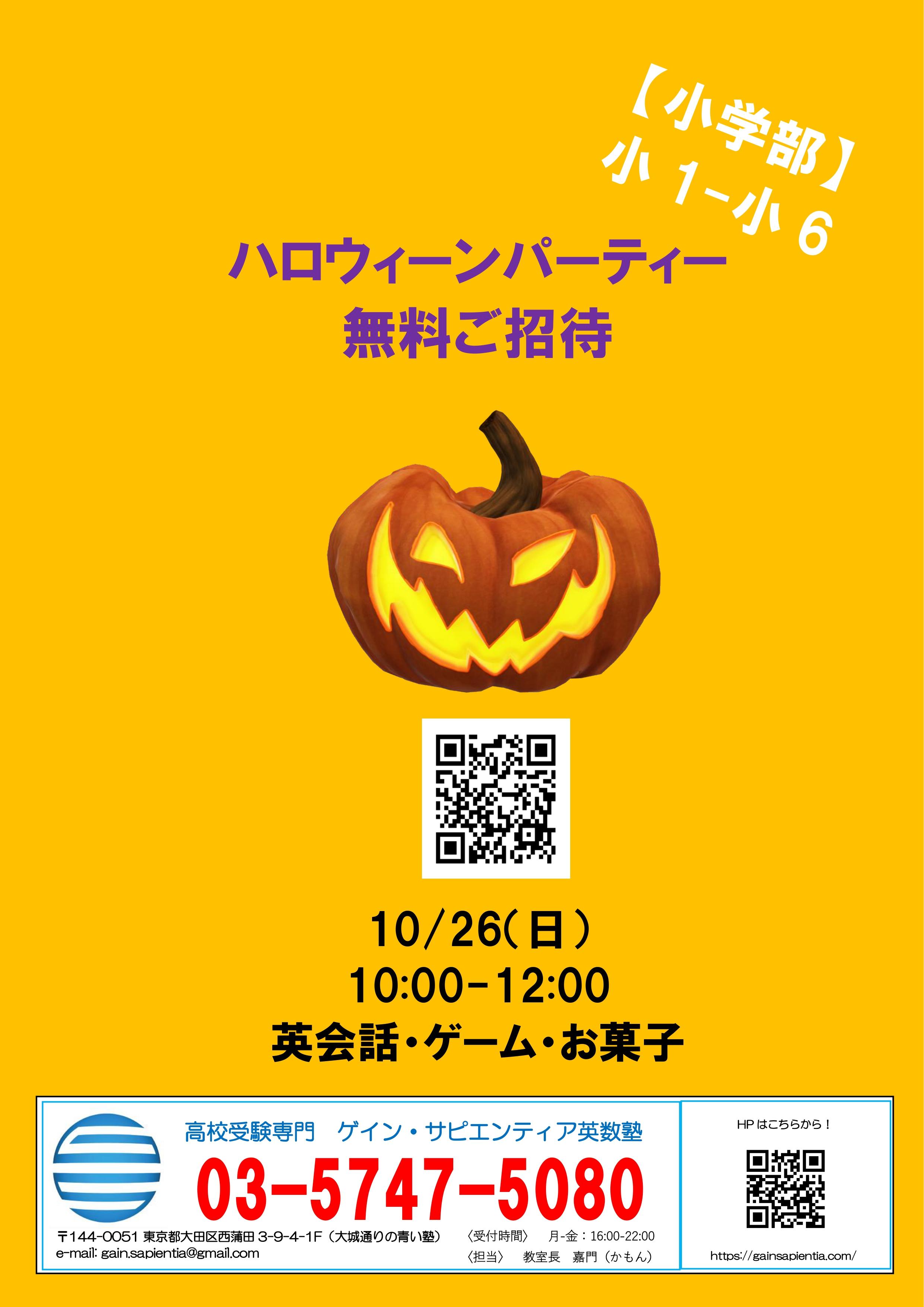 2025,09,15 | 【小学部】10/26(日)、ハロウィーンパーティー(10:00-12:00)を開催します。小1~小6まで、兄弟姉妹・ご友人、みなさん、無料でご招待します。ふるってご参加ください。英語を使ったゲームをして、お菓子をゲットしよう。詳細・お申込みはこちらから⇒【小学部:ハロウィーンパーティー:申込】(googleform)※申込〆切:10/22(水) |