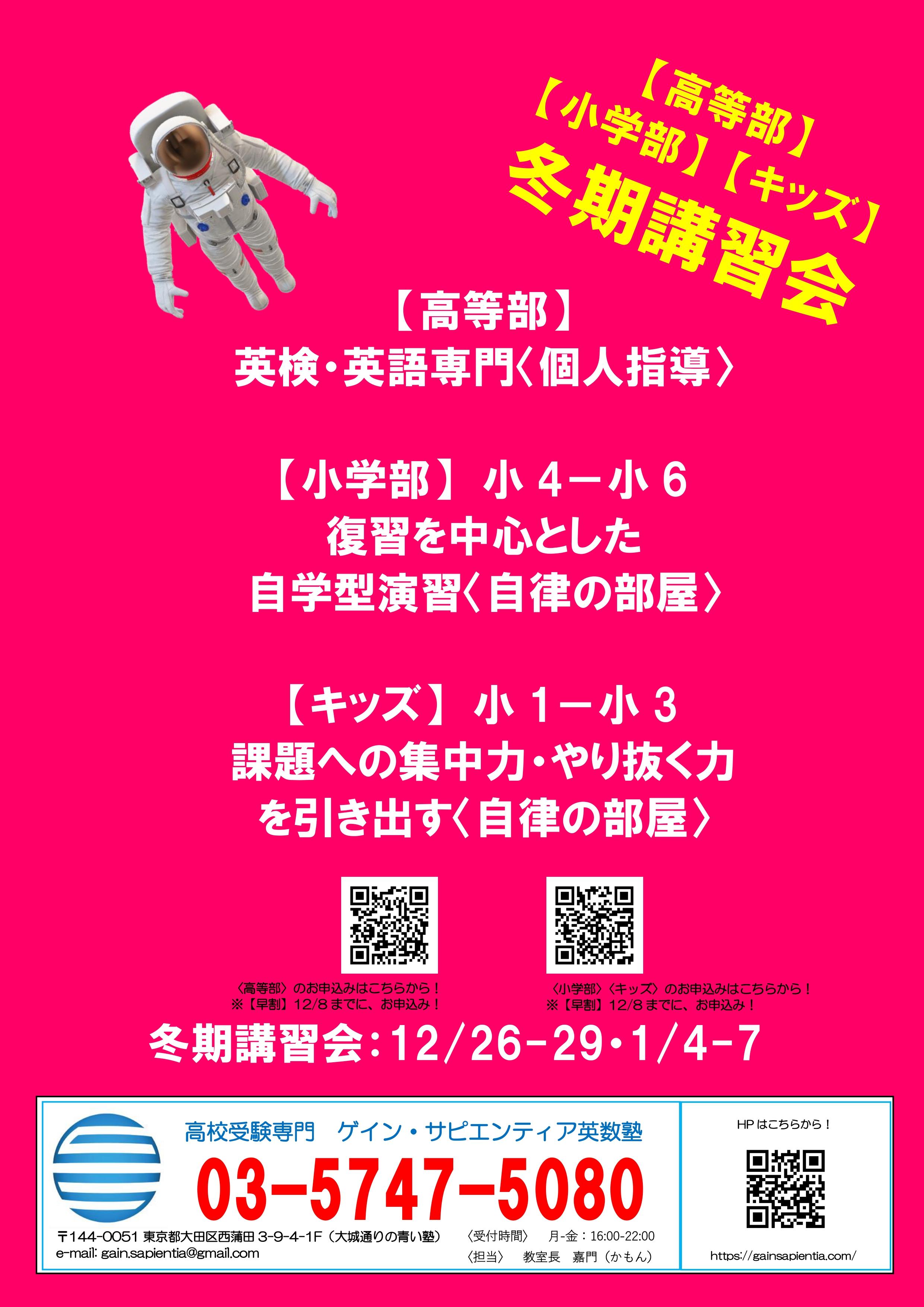 2025,02,10 | 【全生徒】2025年度、新年度資料、新年度説明会の動画が完成しましたので、公開いたします。新しく「都立トップ校受験クラス」や「高等部(英検)」を開講します。【Gサピ新年度資料・動画】(googledrive)はこちらから. |